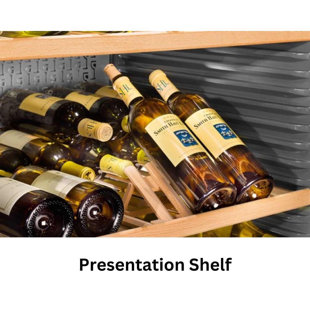 - Presentation shelf: The practical shelf of the Vinidor models fulfills bothbottle storage and presentation functions. The bottles can be stored horizontally at the rear.