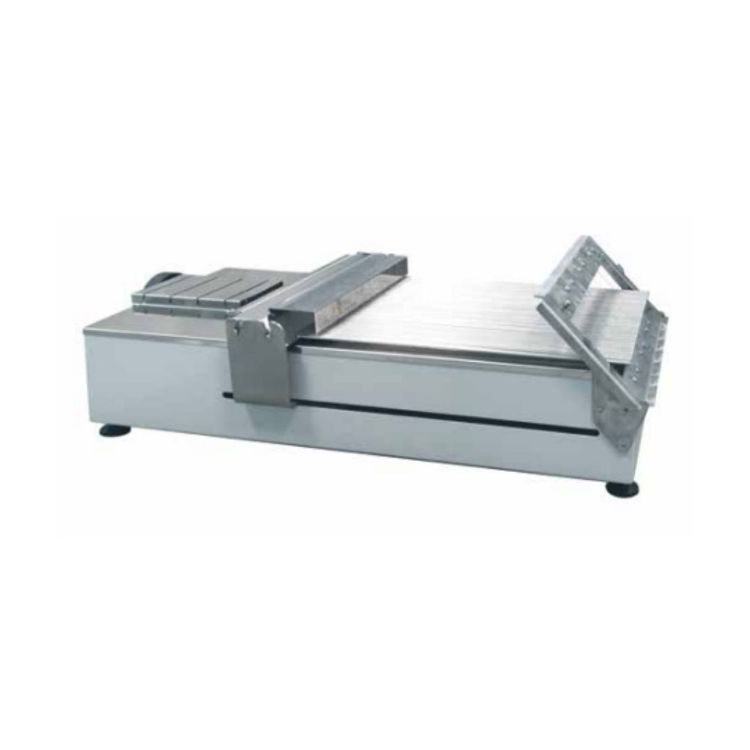 cutters. The frame with the cutting wires is fixed, with a diagonal angle to the product which is pushed towards the frame so as to